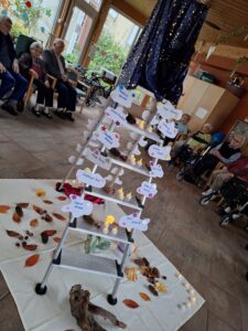 Im Marienstift Schweinfurt wird der Wert der Gemeinschaft nicht nur im Alltag gepflegt, sondern auch im Gedenken an die verstorbenen Mitbewohner und Mitmenschen. Am 01. November 2025 hat sich die Betreuungsgruppe des Marienstift Haus Franziska etwas ganz Besonderes einfallen lassen, um den Verstorbenen einen würdigen und symbolischen Platz zu geben. Eine „Himmelsleiter“ wurde aufgestellt, an der die Namen der verstorbenen Bewohner angebracht wurden. Diese symbolische Leiter sollte den Übergang in den Himmel darstellen und wurde von allen Teilnehmern mit großer Ehrfurcht und Staunen betrachtet.
