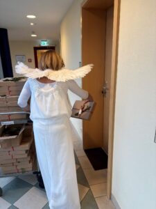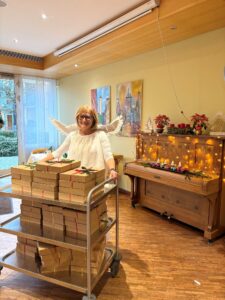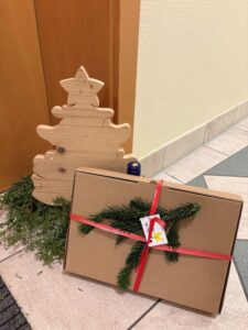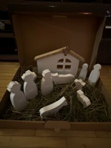 Auch bei uns im Haus flog ein Engel durch die Gänge und verteilte an jede Tür ein kleines, liebevoll selbstgemachtes Geschenk. Diese Geschenke wurden von einer Mitarbeiterin des Hauses gestaltet – kleine Krippen aus Gips, die mit viel Liebe und Handarbeit gefertigt worden waren.