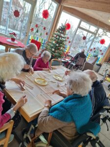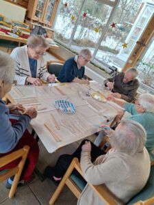 Gemeinsam mit den Bewohnerinnen und Bewohnern wurde in der Gruppe kreativ gearbeitet. Mit viel Freude und Engagement bastelten sie wunderschöne Weihnachtssterne, die anschließend im ganzen Haus aufgehängt wurden und für eine festliche Atmosphäre sorgten.